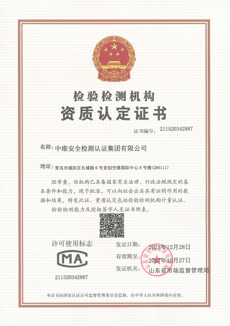 中維集團成立于2012年,在青島市擁有兩處檢驗檢測實驗室,地址分別為:青島市城陽區長城路6號首創空港國際中心9號樓(占地面積約3500平方米)、青島市城陽區棘洪灘街道后海西社區青島新材料科技工業園(占地面積約4500平方米),合計占地面積約8000平方米。上海中維檢測技術有限公司隸屬于 中維安全檢測認證集團有限公司。成立于2015年5月,檢驗檢測地址為上海市漕河涇開發區松江高科技園莘磚公路518號16幢501室、601室,實驗室面積5200余平方米。
